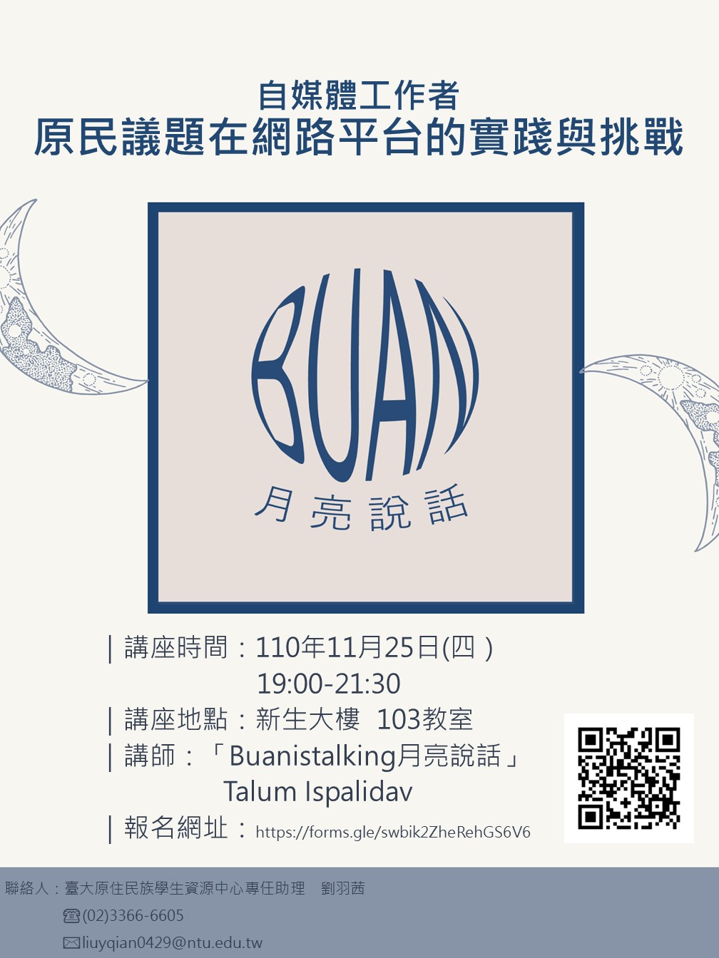 臺大原資中心110-1學期與原聲帶社合辦以原住民議題結合職涯分享的「自媒體工作者:原民議題在網路平台的實踐與挑戰」講座,將邀請Instagram粉絲專頁—「Buanistalking月亮說話」的經營者Talum Ispalidav,來與同學分享自媒體工作者的工作內容,及其在經營議題類型粉專的心路歷程。從創辦粉專的緣由,及希望能透過粉專產生的影響;到經營過程中的改變、學習與挑戰,例如:議題上的選擇、群眾偏好的內容等;最後,再透過問答的方式,讓我們更加認識原民議題在網路平台的新現象。